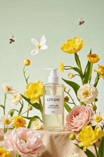 暖粉天空为底,搭配棕色产品、橙花与透明底座,色彩柔和雅致,营造出自然清新又治愈的氛围,尽显产品的温润质感