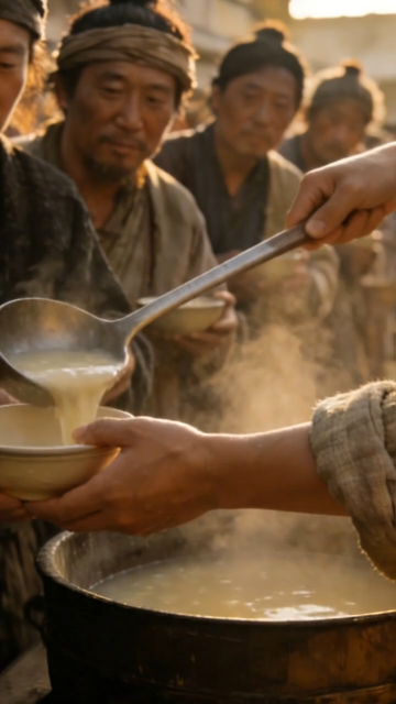 明末难民逃难,正义之士施粥行善的视频。救人一命胜造七级浮屠