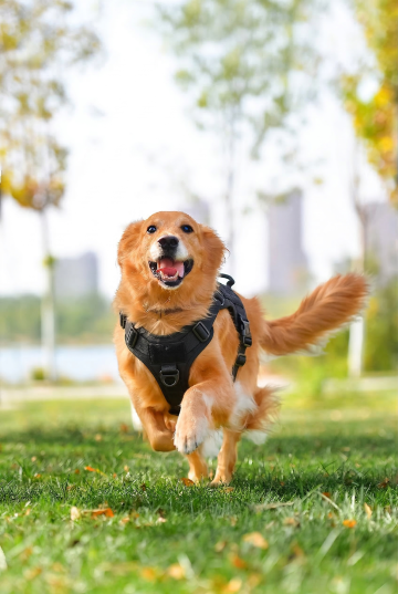 写实风金毛犬奔跑于绿野,光影交错间尽显自然与温馨,毛发生长细腻生动,传递清新舒适与趣味感。