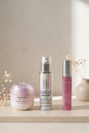 一张极简风格美妆产品集合海报,六个完全不同的美妆元素规整排布在纯白色纯色背景上,保持与原图一致的高清写实摄影风格,主色调为纯净的白色、透明感和产品本身的自然色彩,光线为柔和的顶部柔光,创造出细腻的高光和轻微的投影,突出产品的立体感和材质质感。画面中的六个美妆元素分别为:1. 透明玻璃瓶装的乳霜,带有银色金属旋盖和简约白色标签;2. 磨砂玻璃瓶身的爽肤水,搭配按压式喷头和淡蓝色液体;3. 米色皮革材质的化妆包,带有精致的金色拉链和品牌压纹;4. 五支一套的化妆刷,刷毛呈柔和的浅粉色,刷柄为原木色;5. 圆形粉饼盒,外壳是带有细微珠光的白色塑料,顶部有简约的品牌logo;6. 透明管装的防晒霜,管口为白色旋盖,管身印有淡绿色的产品信息。整体构图采用2x3的网格布局,每个产品间距均匀,保持清晰的视觉层级,没有任何文字、LOGO、电话地址及二维码,画面简洁干净,信息传达高效,符合高端美妆品牌的设计感和审美,目标受众为注重品质与简约美学的年轻女性。