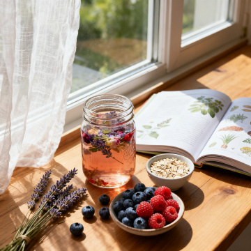 一张温馨明亮的桌面场景照片,柔和的自然光从木质格栅窗洒入,照亮铺着浅米色粗麻布桌布的桌面。桌面上,左侧放着一本翻开的书,书上点缀着两颗鲜红饱满的草莓和一个小巧的浅蓝色陶瓷花瓶,瓶中插着几枝开着白色小花的细枝。右侧是一杯装满纯白色牛奶的透明玻璃杯,旁边放着一个色泽红润的桃子。整体色调清新自然,光影柔和,营造出宁静舒适的居家氛围,具有生活美学的构图和细腻的质感表现。