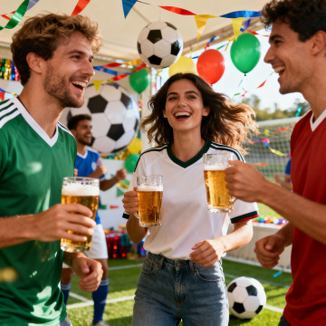 一群人手握装满金黄色啤酒的玻璃杯相互碰杯,杯壁上布满细密气泡,啤酒表面泛着洁白泡沫,阳光透过玻璃杯折射出温暖光泽,背景是户外音乐节现场,舞台上灯光绚丽,台下人群随着音乐舞动,空中漂浮着彩色气球和音符装饰,整体画面呈现出明亮欢快的氛围,光影效果柔和自然,色彩饱和度高,充满热闹欢庆的聚会气息。