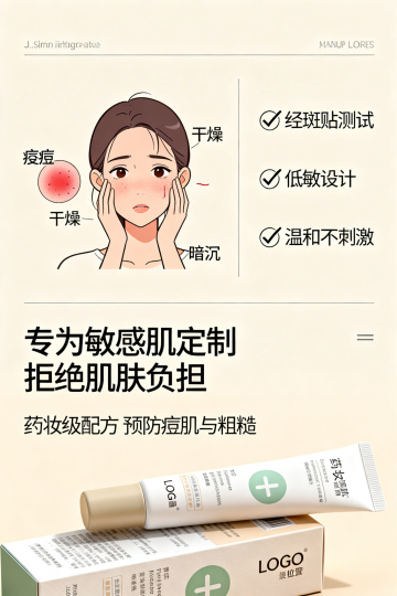 现代感与清新感交织,轻拟物风玻璃瓶身搭配极简主义陈列,柔和色调营造舒适氛围,实景感妆台背景强化时尚质感。