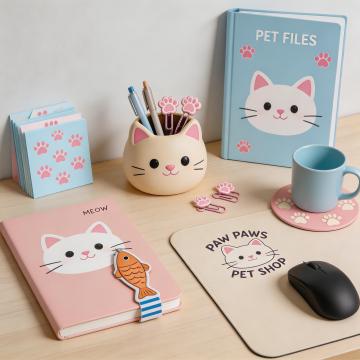 扁平风与轻拟物结合,萌趣猫主题文具套装,手账风设计,粉色系点缀,营造温馨可爱氛围。