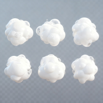 一张深色背景的海报,上面有六个不同样式造型、不同材质的泡沫,这些泡沫上下两行对齐排列。每个泡沫都具有高度写实的质感,表面布满细密的气泡,呈现出柔和的白色,带有微妙的光影变化,高光部分明亮,阴影部分自然过渡,整体营造出轻盈、洁净且具有立体感的氛围。