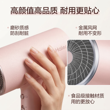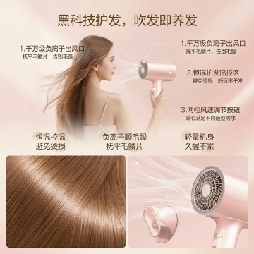 现代简约风设计,融合科技感与清爽质感,采用轻拟物手法呈现清透塑料材质,扁平化视觉强化产品细节,突出负离子护发功能,传递高效速干体验。