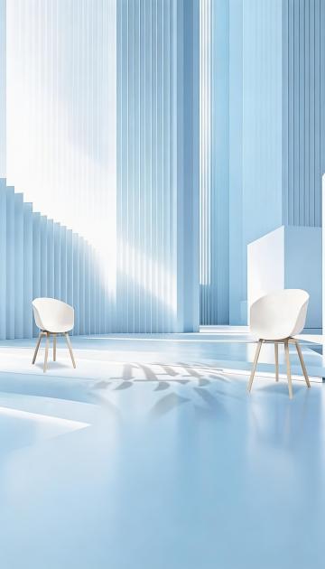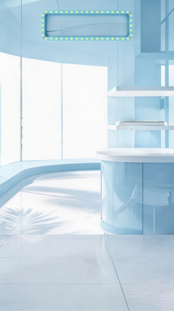 极简主义风格3D渲染,柔和的浅蓝色渐变背景,顶部有流畅曲线构成的白色半弧形装饰,下方是圆形双层台阶式白色展台,展台表面光滑反光,光线从左上方柔和照射,形成轻微的阴影和高光过渡,整体画面干净通透,留白充足,营造出宁静、空旷、简约的空间氛围,无任何文字和装饰元素。