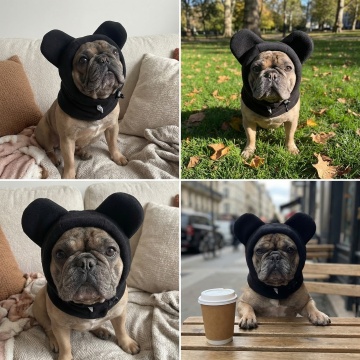 一只戴着金黄色烤吐司切片做成的猫脸面具的小狗,吐司面具边缘略呈焦黄色,表面有细密的烤痕纹理,中间剪出两个圆溜溜的黑色猫眼睛轮廓和一个小巧的粉色三角形猫鼻子,面具两侧有三角形的猫耳朵形状,小狗脖子上系着一条蓝色的领巾,领巾正中间有一个煎蛋造型的装饰,蛋黄呈橙黄色,蛋白为白色,小狗有着蓬松的白色和浅棕色相间的毛发,背景是灰色的沙发和浅色的墙壁,整体画面呈现出温馨、可爱、略带幽默的氛围,光线明亮柔和,对焦清晰,细节丰富。