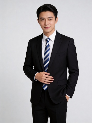 一位年轻亚洲男性,身着剪裁合体的黑色西装,内搭白色衬衫,系着黑色领带,左手自然插在西装裤口袋,右手轻握西装前襟,面带温和微笑,姿态自信挺拔,背景为纯白色,整体呈现清晰、专业、正式的商业人像摄影风格,光线均匀柔和,突出西装的挺括质感与人物的精神面貌。