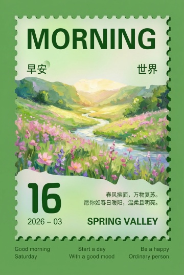 插画风融合厚涂与印象画派笔触,呈现春日山谷的清新与柔和,手账风排版传递舒适感,节日氛围温暖治愈。