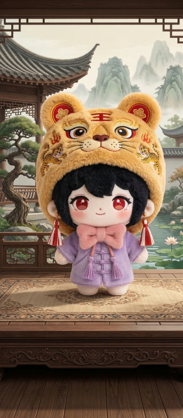 软3D风国潮娃娃,融合中式美学与梦幻色彩,樱花发饰点缀温柔面容,背景山水意境悠远,尽显可爱与唯美感。