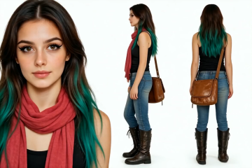 清新自然的妆容搭配绿发与红围巾,营造出时尚与文艺交织的视觉氛围。拼贴式构图融合实景感与杂志风,展现优雅与潮流并存的美学意境。