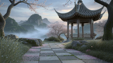 水墨风与3D虚拟现实融合,呈现中式古典仙境,云雾缭绕间飞瀑流泉,亭台楼阁隐现,白鹤翩跹,营造梦幻唯美的静谧意境。
