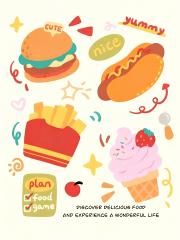 一套6个不同快餐食品的卡通风格插画,保持统一的平面设计风格,每个元素都有厚实的黑色轮廓线,鲜明的色块填充,圆润的形状和简洁的细节表现,整体色彩方案变换为全新的配色系统,所有元素规整地排列在纯色背景上,包含汉堡、炸鸡、薯条、披萨、热狗和三明治,每个食品都保留原有的视觉层级和设计感,确保系列的一致性和识别度。