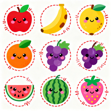 一组6个完全不同水果的卡通风格插画,保持统一的扁平化设计风格,每个水果都有简洁的轮廓线条、明亮饱满的纯色填充和细微的渐变过渡,水果形态卡通化,边缘圆润,高光区域呈椭圆形且位置统一,阴影为同色系深色小圆点。画面整体色彩变换为6种不同的明快纯色背景(如红色、蓝色、绿色、橙色、紫色、粉色),每个水果对应一种背景色。水果元素包括一串葡萄(紫色果实配绿色藤蔓)、一个完整的苹果(红色带绿色叶子)、一根黄色香蕉(带棕色顶端)、一个橙色橙子(带凹陷纹理)、一串绿色猕猴桃(带棕色绒毛质感)、一个紫色李子(带短果柄)。所有水果图像大小一致,按2行3列的规整网格排布在白色背景上,彼此间距均等,形成整齐统一的系列素材集合。