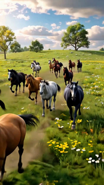3D风格的虚拟自然画卷,群马奔腾于花海草甸,光影交织如油画般唯美的梦幻场景,清新感扑面而来。