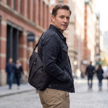 都市街头实景感,现代简约风格,皮革质感夹克搭配牛仔裤,金属拉链细节,展现时尚与商务融合的舒适穿搭。