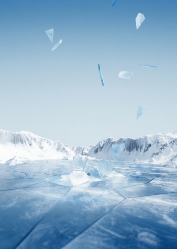 未来感与科技感交织的虚拟自然景观,晶莹剔透的玻璃风冰山在光影中展现极简主义的体积感与3D立体层次。