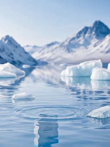 超写实摄影风格,清澈透明的冰块从水面炸裂飞溅,棱角分明的冰晶在空中折射出耀眼的蓝光,水面泛起层层涟漪并倒映着碎冰的清晰轮廓,远处是朦胧的蓝色山脉和渐变的晴空,整体色调以纯净的蓝白为主,光线明亮柔和,营造出寒冷而清新的氛围,冰块的质感晶莹剔透,水珠在冰面上闪闪发光,画面充满动态的瞬间美感。