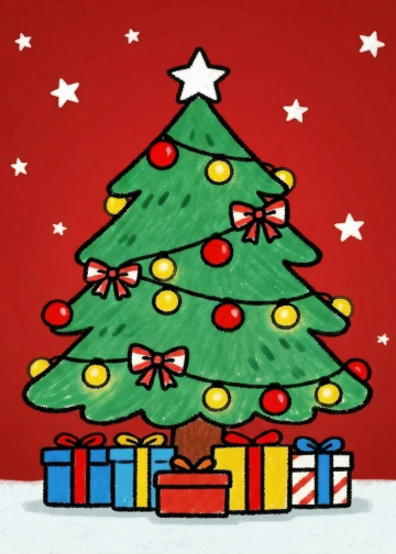蜡笔风插画,拟人化圣诞树萌趣十足,配色梦幻喜庆,充满卡通感与节日氛围。