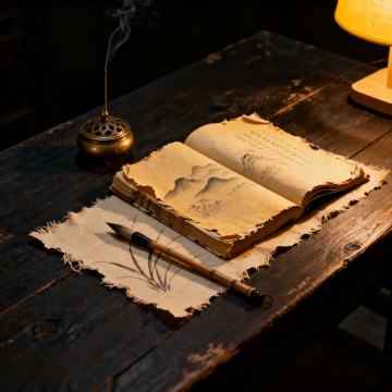 古朴典雅的中式书房一角,深棕色背景墙营造出沉稳静谧的氛围,柔和的侧光从左上角斜射而下,在墙面投下细腻的光影层次。一张深色实木案几上,铺展着一卷泛黄的古籍,书页边缘微微卷起,纸张纹理清晰可见。案几右侧放置着一件精巧的紫檀木笔架,雕刻有缠枝莲纹,底部三足呈兽蹄状,木质表面光滑温润,展现出岁月沉淀的包浆质感。案几边缘有自然的木纹和轻微的做旧痕迹,左侧隐约可见部分雕花屏风的一角,整体画面充满传统文人气息,光影柔和,色调统一,细节丰富,营造出宁静致远的东方美学意境。