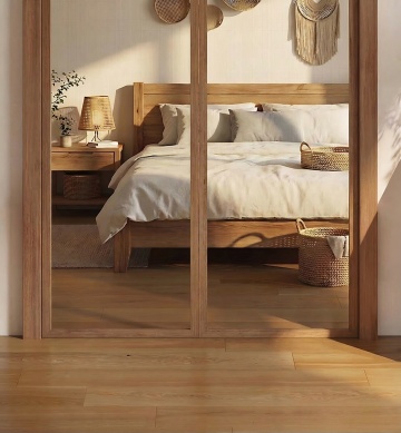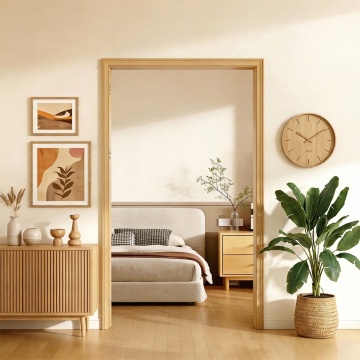 极简主义风格卧室室内设计,从不同角度展现的房间摆设,柔和的浅木色与纯净白色为主的配色方案,阳光透过白色纱帘洒在浅色木地板上形成温暖光影,简约木质床搭配白色床品,床头柜上摆放绿植花瓶与书籍,房间角落有大型绿植点缀,整体空间明亮通透、整洁有序,具有自然清新的氛围和舒适的居住感。