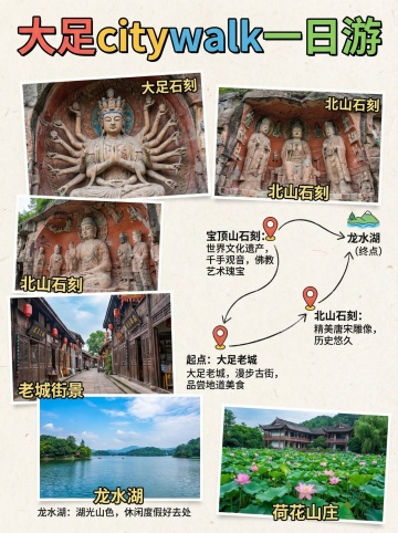 中式古典风融合手账拼贴,实景石刻与浮雕细节交织,呈现大足文化一日游的诗意旅程。