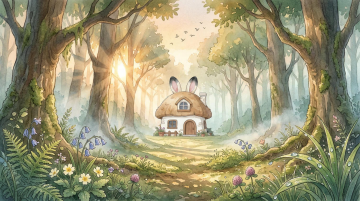 梦幻森林中,拟人化的兔子与蘑菇屋相映成趣,卡通风格营造温馨童话氛围。