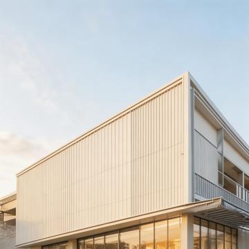 一张现代商业风格的建筑摄影,画面主体为一栋高耸的玻璃幕墙写字楼的顶部及上半部分,大楼外立面由大面积蓝色玻璃和银白色金属框架构成,玻璃反射着纯净的蓝天,呈现出清晰的竖直线条与横向分割的韵律感,建筑顶部有流畅的弧形设计。背景是广阔无垠、饱和度极高的纯蓝色天空,光线明亮且柔和,来自画面上方偏左位置,在建筑边缘形成淡淡的高光和清晰的明暗交界线,整体氛围展现出专业、稳重、现代且充满力量感的商业气质,构图采用从下往上仰拍的角度,强调建筑的宏伟与挺拔,留白充足,信息传达简洁高效,符合面向商业人士、企业客户的审美与宣传目的。