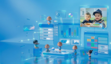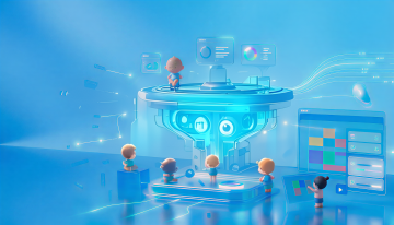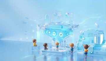 软3D风未来科技场景,卡通人物与机器人互动,虚拟现实体验,色彩明亮。