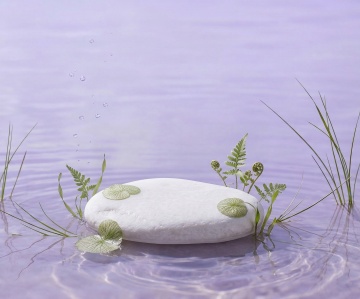 湿润的苔藓覆盖着起伏的地面,中央放置一块表面光滑的圆形青石,周围点缀着带有露珠的蕨类和小型绿色植物,背景是柔和渐变的浅绿色,整体呈现出清晨森林中宁静自然的氛围,光线柔和地洒在苔藓和植物上,营造出清新湿润的感觉。