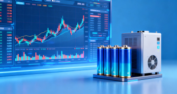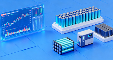 白色背景上,以电池为核心元素,呈现出蓝色和浅蓝色渐变的流体动力学艺术风格。电池形态被抽象化处理,其能量以蜿蜒曲折的蓝色光脉形式向外延伸,光脉线条流畅且具有动感,分支处点缀着细小的深蓝色粒子。整体画面保持简约空灵的氛围,光线从电池内部向外散发,形成明亮的高光和柔和的光晕效果,色彩过渡自然,充满科技感与未来感。