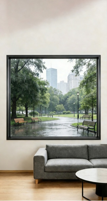 超写实3D渲染风格室内场景,极简主义设计,木质边框的推拉窗,部分磨砂玻璃与透明玻璃结合,窗外是晴朗蓝天与远处的山脉轮廓,窗台下有绿色草坪,室内地面为浅色平滑材质,一侧有木质墙面,自然光从窗户洒入形成柔和光影,营造宁静、通透、自然的氛围,不同角度、场景、布置的窗户设计,包括从室内望向窗外的视角、窗户开启状态的变化、搭配不同室内装饰元素(如简约家具、绿植、水景)的窗户布置,保持原木色与白色为主的柔和色调,强调材质的细腻质感与光影的自然过渡,整体画面干净整洁,空间感强。