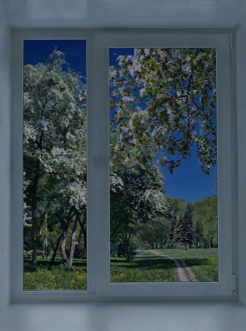 明亮简约的室内空间,不同角度展示的各式窗户,窗框设计简洁,搭配可调节的白色百叶窗,部分叶片打开,透过窗户能看到窗外郁郁葱葱的绿色树木和明媚的自然光,光线在浅色木地板上投下百叶窗的条状光影,窗边摆放着茂盛的绿色植物,整体氛围清新自然、宁静舒适,展现不同场景和布置下窗户与室内环境的和谐融合。
