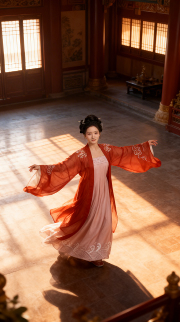 古典中式美学,光影交错间展现工笔风细腻与刺绣风雅致,红衣女子翩然起舞,唯美感与优雅感交融,实景拍摄呈现油画般质感。