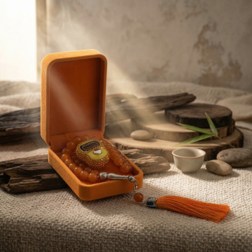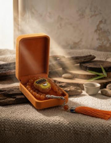 手链缠绕在前景小书上,中景摆放小笔和眼镜,背景虚化阅读角;强光影从顶部阳光投射,影子在书上交织,金黄反射