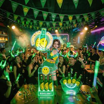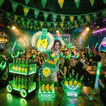 赛博朋克风酒吧,霓虹灯与金属玻璃交织,虚拟现实投影营造未来感空间,酷炫光影映射科技美学。