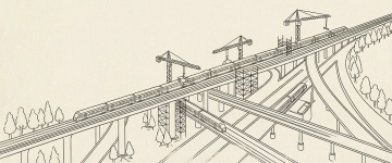 白描风线条勾勒工业感城市交通,2.5D视角呈现微缩艺术般的现代轨道交通,塔吊与高架桥交织科技感,印刷风质感尽显都市建设韵律。