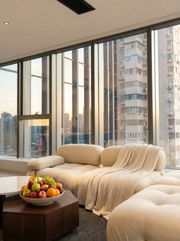 俯瞰视角,极简主义风格客厅以深邃的墨黑与温润的原木色为基调,倾斜45度的构图展现出几何切割般的空间层次感。清晨的冷蓝色光线从整面无框玻璃墙斜射而入,在深灰色微水泥地面上投下窗格的几何阴影,窗外是被薄雾笼罩的城市天际线剪影。中央悬浮着一个由黑色金属框架与烟熏玻璃台面构成的不规则多边形茶几,周围环绕着三张浅灰色模块式布艺单人沙发,每个沙发配有一个芥末黄皮质靠垫。右侧墙面是整面的胡桃木饰面板,内嵌线性LED灯带勾勒出隐藏式储物空间的轮廓。天花板采用悬浮式设计,中央垂挂着一个由12个不规则玻璃球体组成的艺术吊灯,在地面投射出破碎的光斑图案。空间角落摆放着一株大型琴叶榕,其深绿色叶片与整体冷色调形成鲜明对比。地面铺设着一块巨大的米白色羊毛手工编织地毯,边缘处有渐变的黑色几何图案。整体氛围呈现出一种冷静的奢华感,光线在不同材质间的反射创造出丰富的视觉层次,既保留了原空间的通透感,又通过色彩与光影的转变赋予其北欧极简的清冷美学。