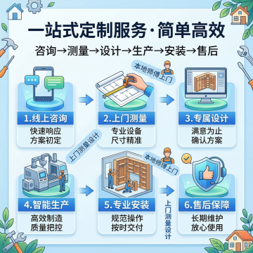 主标题文字"一站式定制服务·简单高效",副标题文字"咨询→测量→设计→生产→安装→售后",步骤化流程图,用图标 + 文字展示从线上咨询到售后保障的6个环节,背景为浅色系,搭配"本地师傅上门""上门测量设计"的字样,清晰传递定制便捷性