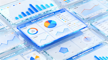 3D风格的宣传界面,画面的主体居左,主体是一个带有图表、数据模块等元素的白色立体分层面板,周围漂浮着蓝色统计图表形状物件,玻璃磨砂质感。画面右侧留白。整体色调以白色为底,搭配蓝色元素,背景是炫彩浅蓝色,呈现出简洁、现代、科技感的视觉效果