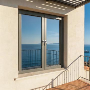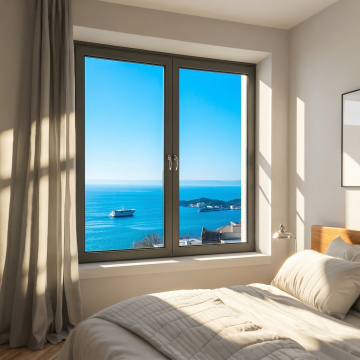 一张现代风格的室内窗户特写照片,采用高清晰度3D渲染技术,光线明亮柔和,以自然光为主,从窗外照射进来,营造出通透、干净的氛围。窗框材质为深灰色金属,表面光滑带有细微的哑光质感,搭配一个金色的金属把手,位于窗框右侧中间位置。窗外是城市景观,有高楼大厦、绿树和街道,但窗户本身的构造为全新设计的样式——[请在此处插入您希望的全新窗户构造描述,例如:上下推拉式双层玻璃窗,带有横向分隔条和内置百叶帘;或左右对开式拱形玻璃窗,边缘有精致的雕花装饰;或不规则多边形全景落地窗,无明显分隔但有隐藏式边框]。室内墙体为纯白色,窗台下是浅色的洗手台一角,整体画面构图平衡,色彩以黑白灰为主色调,辅以窗外的自然绿色和建筑色彩,视觉层级清晰,窗户作为主体被突出展示,细节丰富,真实感强,符合现代家居设计的审美和展示需求。