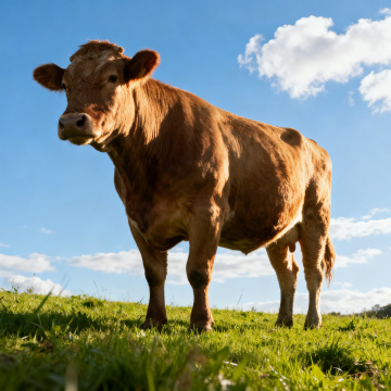 一头健壮的牛站在绿色的草地上,背景是蓝天白云,阳光明媚,自然写实风格,画面清晰生动
