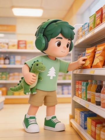 3D风卡通男孩悬浮于透明玻璃质感轨道,佩戴耳机畅享音乐,未来感科技线条环绕,塑料光泽与虚拟现实元素交织,清新绿调营造轻盈梦幻氛围。