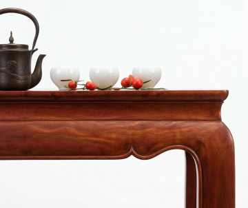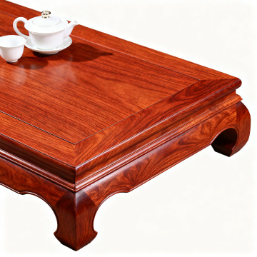 一张中式古典风格的实木长桌特写,桌面呈现温润的浅棕色木纹,边缘为深棕色雕花实木边框,桌腿带有精致的传统中式镂空雕刻纹样。背景是一幅模糊的古画,整体画面采用暖色调光线,光线从斜上方照射在桌面上,形成柔和的光影过渡,营造出宁静、典雅、富有文化底蕴的氛围。画面聚焦于桌子的质感和细节,木纹清晰可见,雕花精致细腻,整体构图采用近景特写,突出实木家具的自然纹理与工艺美感,具有浓厚的东方传统韵味和古朴雅致的设计感。