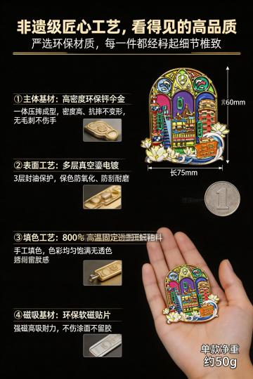 中式建筑微缩插画徽章,融合复古描边与金属浮雕工艺,喜庆色彩搭配祥云、花鸟元素,展现浓厚民族风情与节日氛围。