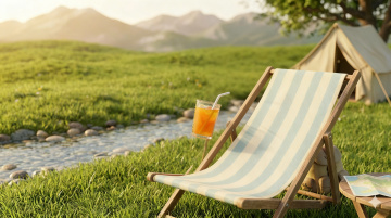 一幅印象派风格的森林休憩场景油画,画面中阳光透过茂密的树林洒下斑驳光影,前景是翠绿的草地,中央摆放着一把浅色木质框架的帆布椅,旁边是一张小木桌,桌上放着一个相框和一个小收音机,背景是高耸的树木,整体色调温暖柔和,笔触松散而富有动感,营造出宁静惬意的氛围。