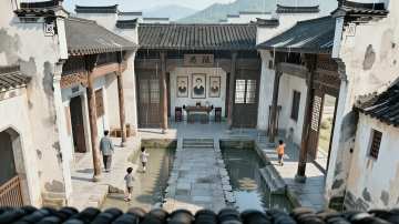 中式庭院3D重拟物风格,水墨质感融合石刻细节,展现古典质朴的家族生活场景。