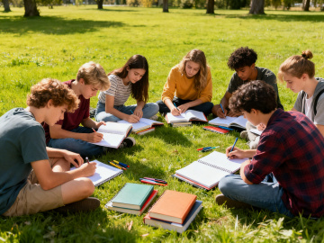 现代简约教室,科技设备与书籍交织,自然光洒落,清新明亮。