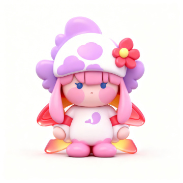 软3D风格的可爱小兔女孩,手持彩虹伞立于梦幻花丛,毛发生长风与塑料质感融合,营造清新卡通感的虚拟自然场景。